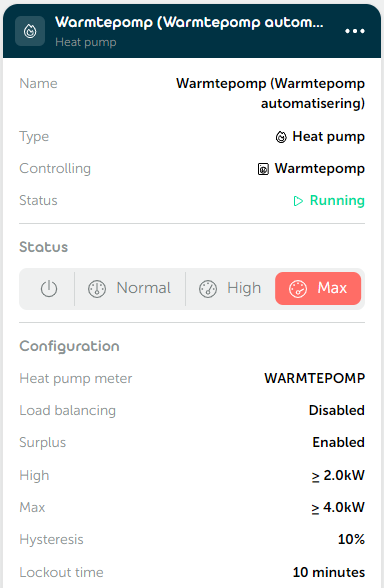 - Max threshold (W): Surplus power above this value switches the heat pump to Max mode. Default: 4,000 W.
