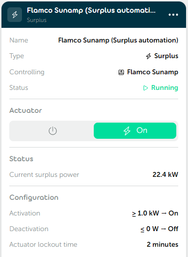 With the surplus automation, Currentt automatically switches an actuator on or off based on available solar surplus. The actuator is activated once the surplus power exceeds a set threshold, and deactivated when the surplus drops away.