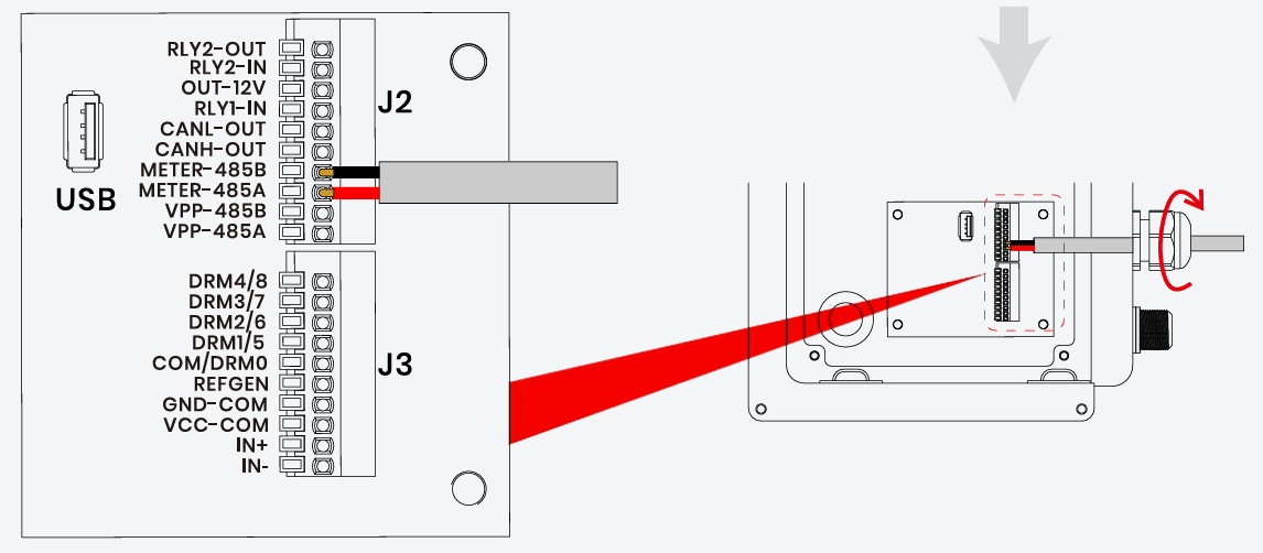 - Connect an RS-485 cable to the VPP-485A (A) and VPP-485B (B) terminals on the WHES PP-T1