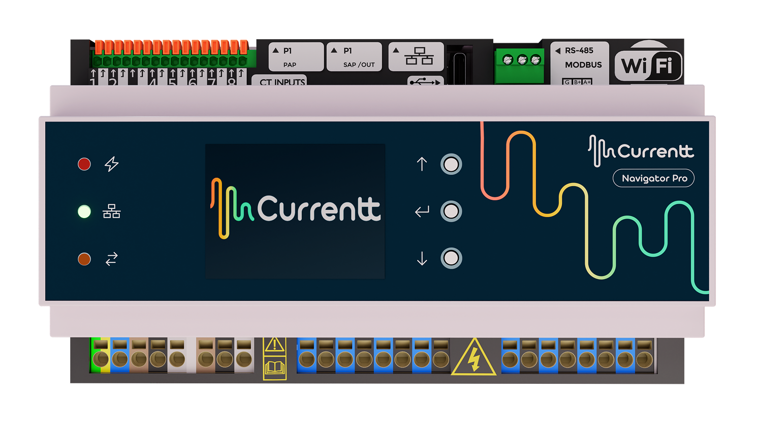 De Currentt Navigator heeft 8 ingangen voor CT-klemmen. Hiermee kun je bijvoorbeeld maximaal 8 enkelfasige meters configureren, of 2 driefase meters en nog 2 enkelfasige meters (2 x 3 + 2 = 8 kanalen).